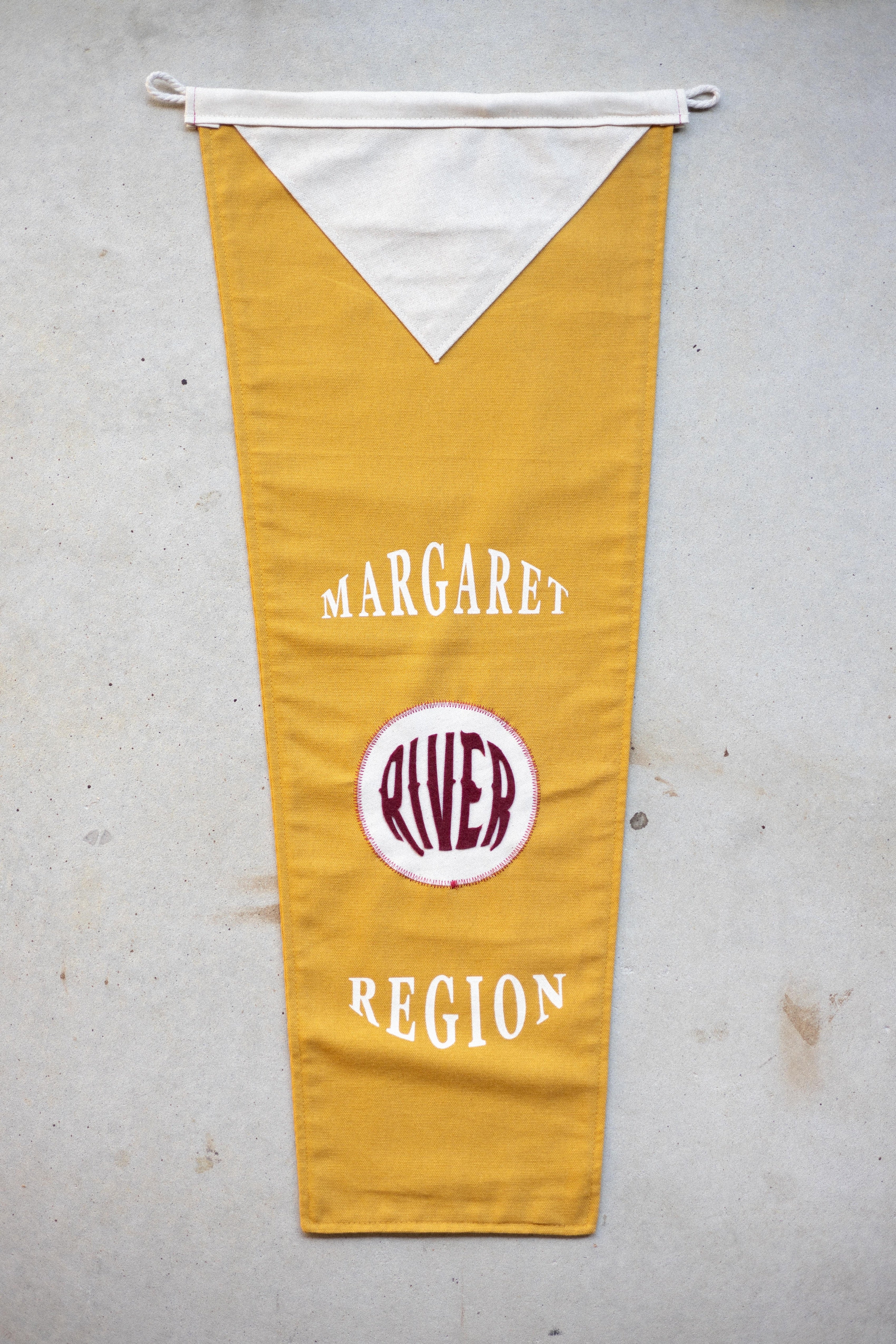 Margaret River 2nd Edition pennant. This is a vintage inspired keepsake for the places and spaces you've been to. Not perfect, not mass produced. Each flag has a batch number written on...